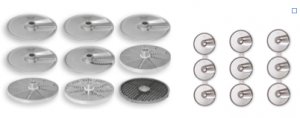 Диски режущие в комплекте из 9 штук 84016 для машин для резки овощей т.м. HALLDE мод. RG-350Состав комплекта: Диски для нарезки ломтиками 1,5, 4, 6, 10 мм Диск для нарезки соломкой 4х4 мм Тёрки/Измельчители 2 и 8 мм Тёрка мелкая Решётка для нарезки кубиками 10х10 мм