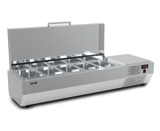 Холодильная витрина для ингредиентов Carboma A30 SM 1,2 с крышкой нерж. (VT2-G с крышкой (GN1/4)) оборудование может быть установлено на борта специальных столов для приготовления пиццы, а так же может использоваться, как самостоятельное изделие, и снабжено регулируемыми ножками-опорами. По конструктивному исполнению витрина холодильная состоит из теплоизолированного корпуса со встроенным холодильным модулем. Крышка над холодильным агрегатом выполнена в виде горизонтальной площадки и выполняет роль столешницы для сопутствующих и вспомогательных предметов. Испаритель расположен внутри ванны для гастроёмкостей. В ванне имеется отверстие для слива конденсата, который попадает в специальную ёмкость с выпаривателем в машинном отделении. Все элементы корпуса, которые могут соприкасаться с продуктами питания, изготовлены из нержавеющей стали. Для включения и настройки параметров витрина снабжена выключателем и контроллером.