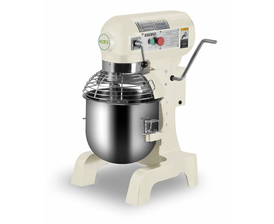 Планетарный миксер FIMAR EasyLine B20K предназначен для замеса различного вида теста: тесто для пиццы, хлеба, печенья, круассанов, булочек, профитролей, бисквита, песочного теста, безе, пюре, различных соусов и взбитых сливок на предприятиях общественного питания и торговли, в пекарнях и кондитерских. Модель оснащена микровыключателем на защитном приспособлении дежи и крышке. Корпус покрыт стойкой к механическим воздействиям краской, дежа, защита дежи и венчик - из нержавеющей стали AISI 304, крюк и лопатка - из алюминия.