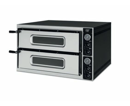 Печь для пиццы GGF BASIC 44 представляет собой печь для приготовления пиццы. Модель предназначена для оснащения пунктов общественного питания, пиццерий, кафе, а также магазинов с собственным гастрономическим отделом. Печь отлично подходит для приготовления пиццы, лепешек, осетинских пирогов и прочих хлебобулочных изделий. В конструкции предусмотрено две камеры, вмещающая в себя до 4 пицц каждая. На корпусе установлена электромеханическая панель управления, на каждой дверце предусмотрено смотровое окно. В печи установлены прочные нагревательные элементы. Корпус выполнен из нержавеющей стали. Внутри камеры установлен огнеупорный камень.