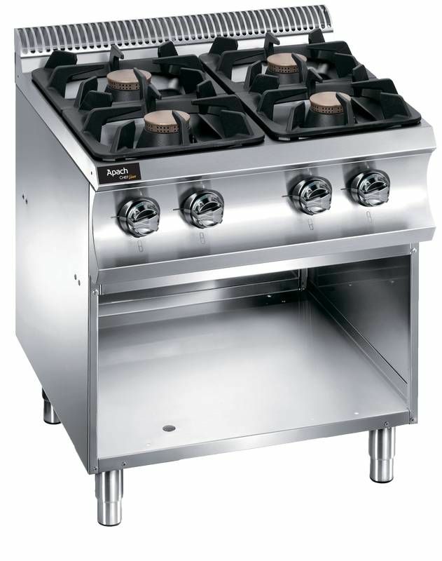 Apach Chef Line GLRRG89OS представляет собой газовую плиту, предназначенную для профессионального применения. На корпусе расположено 4 газовых горелки мощностью по 9 кВт каждая. Их накрывает мощная решетка, рассчитанная на высокие нагрузки. Плита управляется с помощью поворотных регуляторов эргономичной формы.