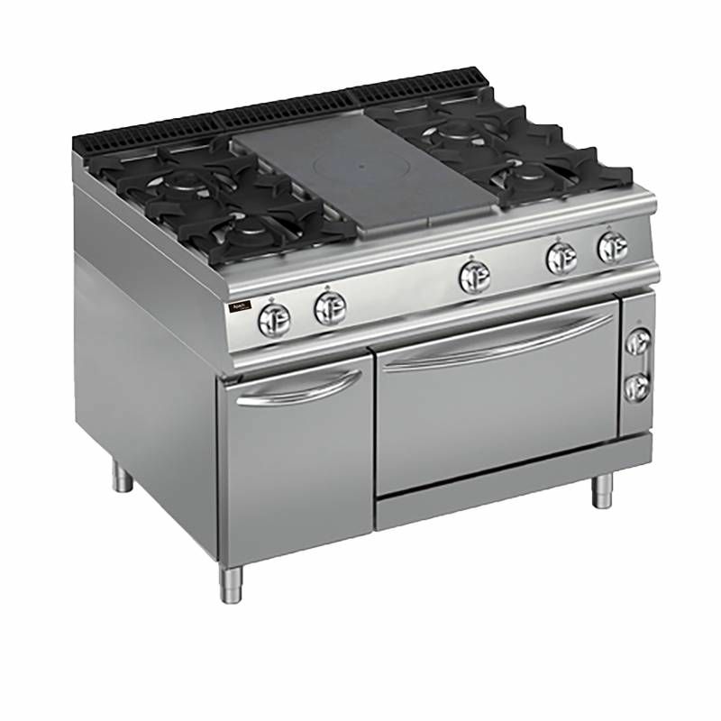 Apach Chef Line LRSTG127R4FE – профессиональная плита с газовой варочной поверхностью и электрическим духовым шкафом. Модель рассчитана на профессиональное применение. Она идеально подходит для установки в пунктах общественного питания, торговых точках, на пищевых производствах. На варочной поверхности расположена концентрическая зона нагрева и четыре газовых горелки, по две с каждой стороны. В нижней части расположена электрическая духовка мощностью 6 кВт и закрытый отсек для хранения.