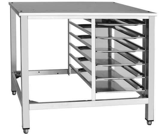 Подставка Abat ПК-6МФ используется совместно с пароконвектоматом ПКА 6-1/1 ПМФ на морских судах, на площадках в открытом море и на береговых линиях. Модель оснащена направляющими специальной формы, предотвращающие самопроизвольное выкатывание гастроемкостей при качке и регулируемыми по высоте ножками с резиновыми вставками.