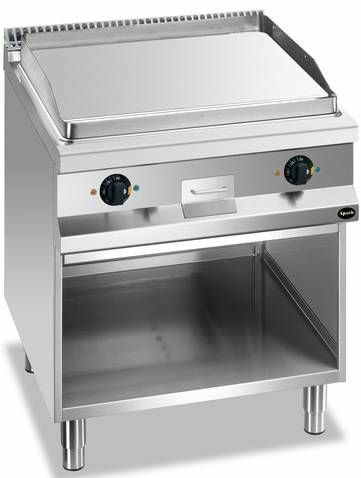 Рабочая поверхность стальная оснащена зоной сбора конденсата. С трёх сторон приподнятые бортики сковороды предотвращают разбрызгивание жира. Небольшой наклон сковороды вперед. Емкость для сбора излишков жира. Вытяжная решётка вдоль модуля. Зона хранения открытого типа. Регулировочная электромеханическая панель. Дисковые регуляторы температур отдельные для каждой половины сковороды.