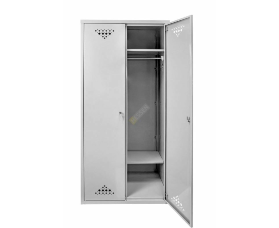 Hessen ШР 2/800 представляет собой шкаф для одежды. Модель предназначена для оснащения предприятий разного типа, рассчитана на организацию хранения вещей, одежды, обуви. Шкаф имеет двухсекционную конструкцию. Он оснащен двумя полками, крючками. Шкаф закрывается на глухие дверцы со встроенным замком.