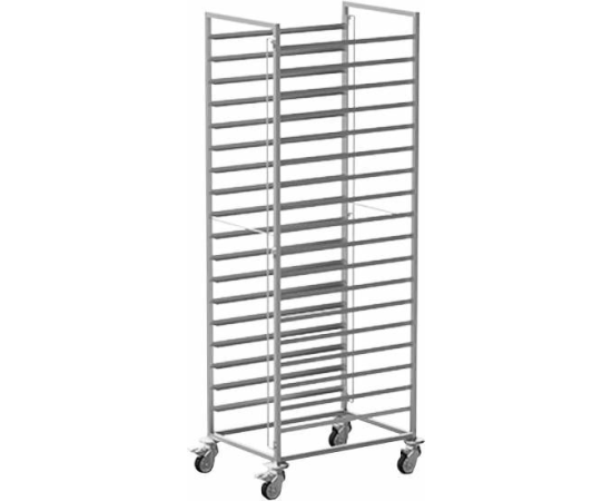 UNOX XTB0003 представляет собой тележку-шпильку, предназначенную для организации перемещения, временного хранения противней и пекарских листов размером 400х600 мм. В конструкции предусмотрено 18 уровней, расстояние между ними составляет 80 мм. В качестве материала изготовления каркаса используется прочная сталь. Тележка установлена на 4 поворотные колесные опоры. Тележка может использоваться для совместной эксплуатации с пароконвектоматами серии BakerLux Shop.Pro и BakerTop Mind.Maps.