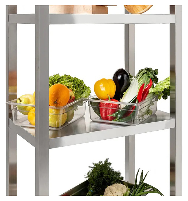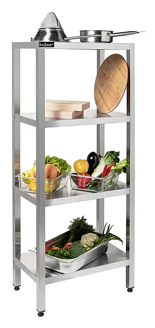 Стеллаж Кобор СКТ-100/30 предназначен для хранения посуды, кухонной утвари и сухих продуктов на предприятиях общественного питания, торговли и в промышленно-производственных помещениях. Каркас выполнен в виде уголка 40х40 мм из оцинкованной стали, полки - из нержавеющей стали AISI 430. Сварная конструкция обеспечивает жёсткость стеллажа.