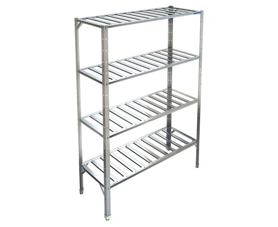 Кухонный стеллаж Техно-ТТ СТР-024/1800 предназначен для хранения посуды, различного инвентаря и сухих продуктов на предприятиях общественного питания и торговли. Модель оснащена регулируемыми по высоте полками и ножками, что позволяет компенсировать неровности пола. Разборный каркас выполнен из уголка 40х40 мм нержавеющей стали AISI 430 толщиной 2 мм, решетчатые полки - из нержавеющей стали AISI 430 толщиной 0,8 мм.