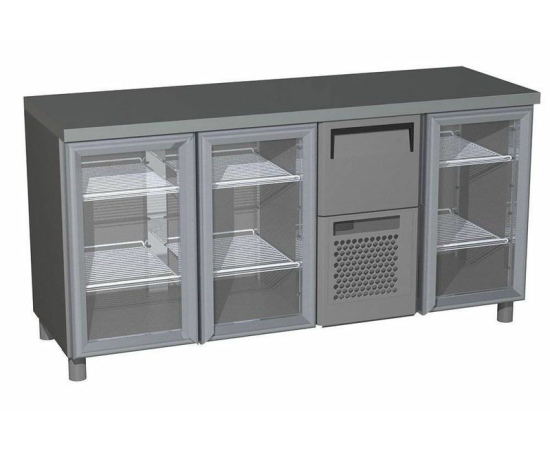 Стол холодильный Сarboma T57 M3-1-G X7 9005-1 (BAR-360C) интересен не только великолепным функционалом и комплектацией, но и эффектным внешним видом, полученным за счет сочетания серебристого цвета нержавеющей стали столешницы с черным цветом окрашенных корпусных деталей. В виде дополнительного штриха разработчиками предложены три изящные стеклянные двери распашного типа. Модель идеально впишется в темный интерьер бара, кофейни или кондитерской, где будет совмещать функции гигиеничной рабочей поверхности и холодильного шкафа.