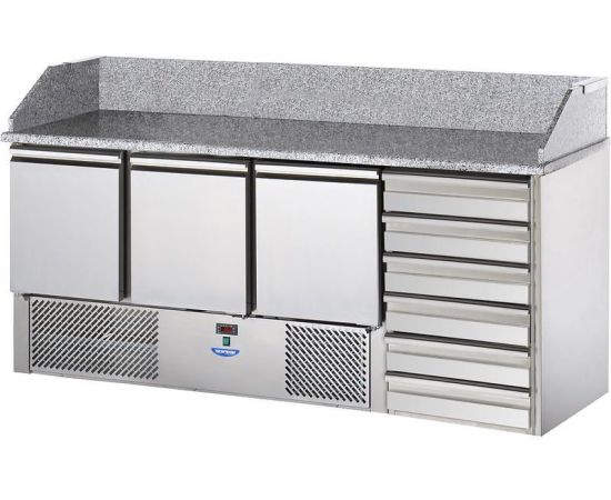 Стол для пиццы Tecnodom SLV03C6 используется на предприятиях общественного питания и торговли для раскатки теста и обработки ингредиентов, используемых для приготовления пиццы, салатов и других блюд, а также для охлаждения и кратковременного хранения скоропортящихся продуктов и напитков. Модель оснащена электронной панелью управления с NTC датчиком, столешницей с бортом и 6 нейтральными ящиками с контейнерами из полипропилена. Корпус, за исключением агрегатного отсека, выполнен из нержавеющей стали, столешница - из гранита, теплоизоляция - полиуретан, впрыскиваемый под высоким давлением.