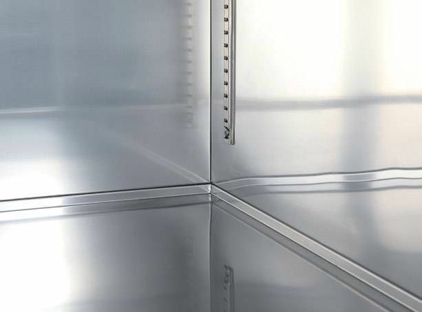 • Система охлаждения гастроемкостей распределяет холодный воздух по всей площади гастроемкостей, охлаждая не только дно, но и фронтальные, тыльные и боковые стенки: поддержание температуры продукции ниже 5°С даже при открытых крышках