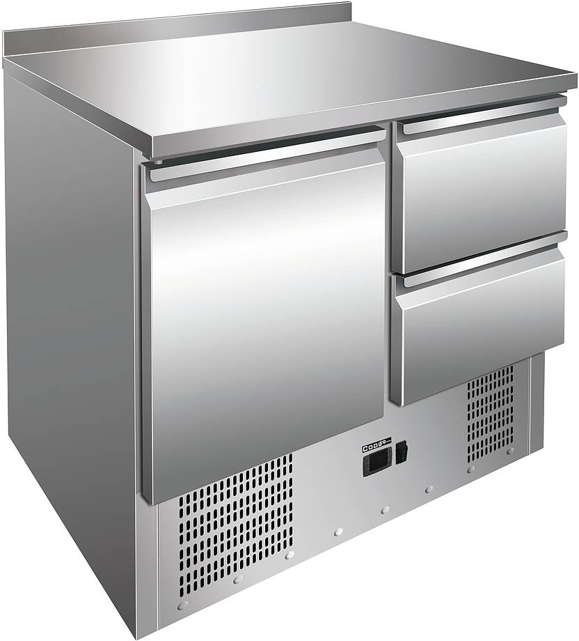 Стол холодильный COOLEQ S901-2D бортик 2 ящика - используется в ресторанах, кафе, пиццериях и других заведениях общественного питания для раскатки теста, охлаждения, кратковременного хранения и обработки мяса, рыбы, овощей, фруктов и других продуктов. В стол встроен холодильный шкаф с искусственным охлаждением внутреннего объема. Столешница из нержавеющей стали выполняет функцию рабочей поверхности повара. Одна секция укомплектована двумя ящиками.