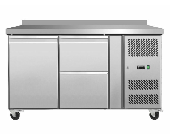 Стол холодильный Koreco GN/2100TNL1D2/W предназначен для обработки ингредиентов и кратковременного хранения предварительно охлажденных пищевых продуктов на предприятиях общественного питания и торговли. Гастронормированный пристенный стол c 1 дверью и 2 ящиками.