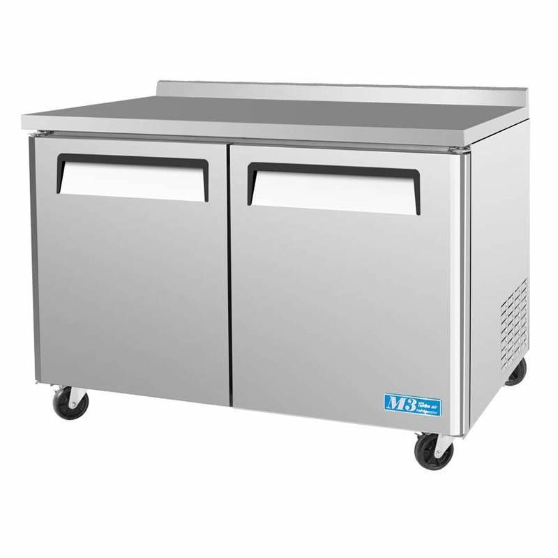 Холодильный стол Turbo air CMWR-48 предназначен для раскатки теста, обработки, охлаждения и кратковременного хранения продуктов и напитков на предприятиях общественного питания и торговли. Корпус выполнен из нержавеющей стали (гальванизированная сталь на оборотной стороне и внизу) с применением пожаробезопасных стенок толщиной 60 мм, уплотнения - из АБС-пластика, пол - из нержавеющей стали с алюминиевыми вставками по бокам и сзади оборудования, регулируемые полки - из толстой стальной проволоки с виниловым покрытием.