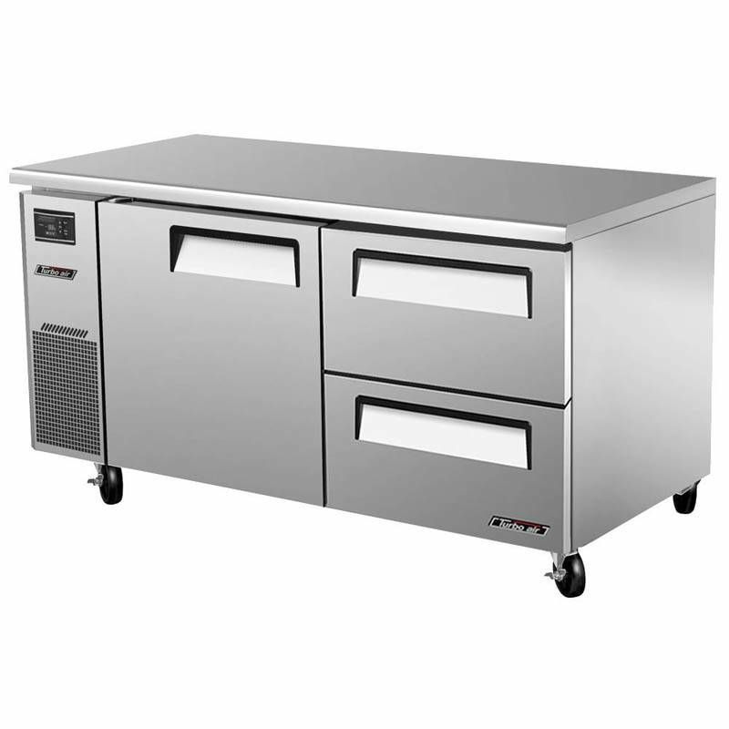 Морозильный стол Turbo air KUF15-2D-2-700 предназначен для обработки, охлаждения, заморозки и длительного хранения пищевых продуктов на предприятиях общественного питания и торговли. Модель оснащена дверцей, полкой, 2 ящиками, эргономичными ручками и 4 колесами. Корпус выполнен из нержавеющей стали (гальванизированная сталь на оборотной стороне и внизу), пол - из нержавеющей стали с алюминиевыми вставками по бокам и сзади, тройные направляющие ящиков - из нержавеющей стали, уплотнение - из ABS-пластика.