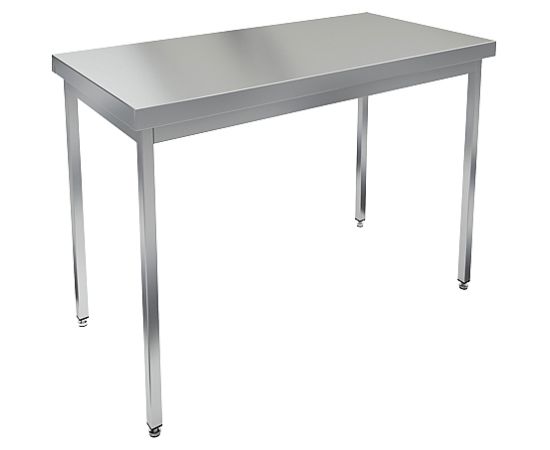 Столешница выполнена из нержавеющей стали толщиной 0,8 мм, усилена листом ДСП, опорные ножки - из трубы 40х40 мм из нержавеющей стали.