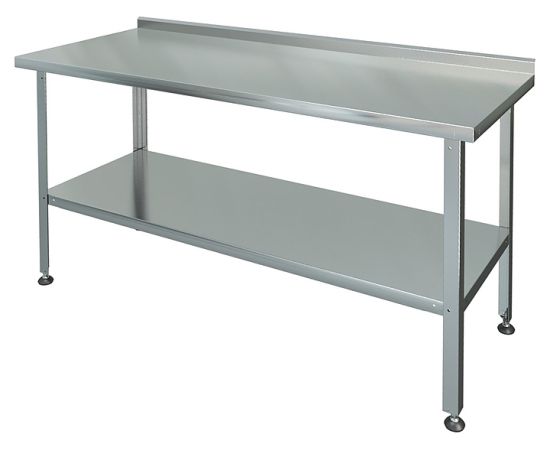 Производственный стол Марихолодмаш СРП-1-0,6/1,0-П предназначен для раскатки теста и обработки ингредиентов для приготовления блюд, а также может использоваться в качестве дополнительного места для установки кухонных приборов на предприятиях общественного питания и торговли. Рабочая поверхность, усиленная ЛДСП толщиной 15 мм, выполнена из нержавеющей стали AISI 430 толщиной 0,5 мм, полка - из нержавеющей стали AISI 430, ножки с регулируемыми опорами - из уголка 40х40 мм из оцинкованной стали толщиной 1 мм с подгибом краёв вовнутрь.