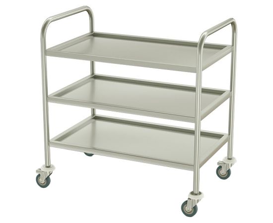 Сервировочная тележка ATESY ТС-С-3-800.500.850-02 серии Стандарт используется на предприятиях общественного питания для перемещения готовых блюд, напитков и посуды в зал приема пищи, а также для подачи грязной посуды из зала в моечное отделение. Модель оснащена 3 вместительными полками с бортиками. Полки выполнены из нержавеющей стали AISI 430, рамы - из нержавеющей трубы AISI 201 диаметром 25 мм.