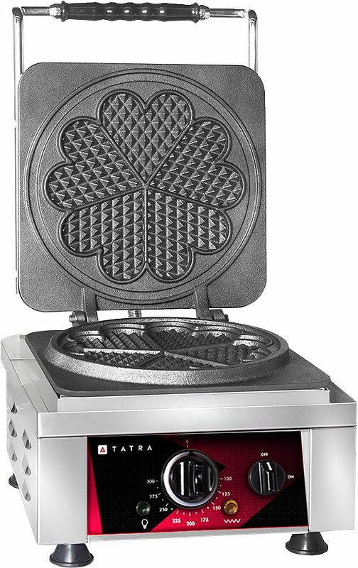 Вафельница Tatra​ TWI 1 AMORE предназначена для выпечки вафель в форме сердца на предприятиях общественного питания и торговли. Модель оснащена электромеханической панелью управления с терморегулятором, 1 зоной выпечки, емкостью для сбора жира и индикаторами питания и нагрева. Корпус выполнен из нержавеющей стали, несъемные рабочие поверхности - из чугуна.