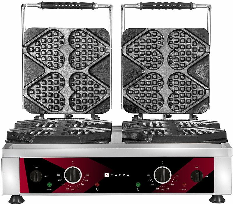 Вафельница Tatra​ TWI 2 TIAMO предназначена для выпечки вафель в форме сердца на предприятиях общественного питания и торговли. Модель оснащена электромеханической панелью управления с терморегулятором, 2 зонами выпечки с независимым управлением, емкостью для сбора жира и индикаторами питания и нагрева. Корпус выполнен из нержавеющей стали, несъемные рабочие поверхности - из чугуна.
