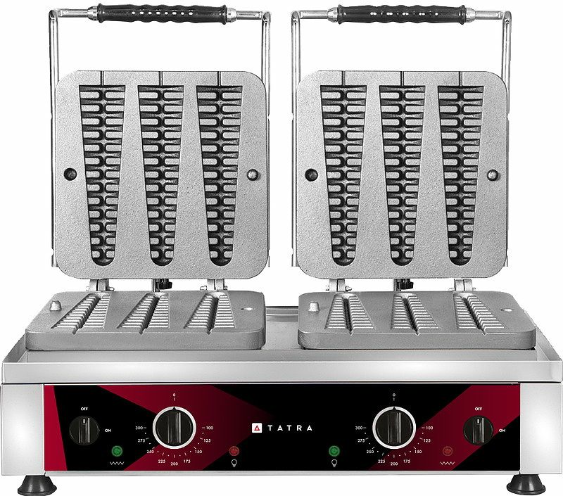 Вафельница Tatra​ TWI 2 WAFFELINO предназначена для выпечки вафель в форме конуса на предприятиях общественного питания и торговли. Модель оснащена электромеханической панелью управления с терморегулятором, 2 зонами выпечки с независимым управлением, емкостью для сбора жира и индикаторами питания и нагрева. Корпус выполнен из нержавеющей стали, несъемные рабочие поверхности - из чугуна с тефлоновым покрытием.