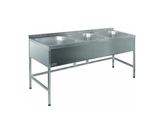RADA ВВ3/553-18/6БН представляет собой моечную ванну, предназначенную для оснащения пунктов общественного питания, торговых точек. Она прекрасно подходит для организации мытья посуды, кухонных принадлежностей. В конструкции предусмотрено 3 цельнотянутые раковины размером 500х500 мм. Для из производства использовалась нержавеющая стали марки AISI 304 толщиной 1 мм. Каркас выполнен из стали марки AISI 304 толщиной 1.5 мм. Обвязка ножек выполнена с трех сторон, что повышает устойчивость конструкции. Опоры регулируются по высоте.
